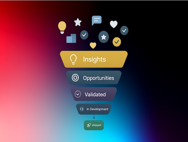 At the top of the funnel are raw insights, customer conversations, support tickets, sales feedback, analytics, and market signals. This is the lead pool. It’s noisy, unstructured, and full of potential.
